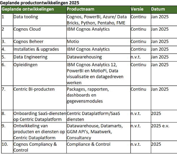 De basis (laag 1) van het Centric Dataplatform is beschikbaar en in gebruik genomen in combinatie met Centric Leefomgeving. De eerste klanten van die oplossing zijn hier ook al op geland en uitrol van de overige klanten staat gepland. Voor Centric Financiën en de Suite4Sociale Regie geldt hetzelfde. Uitrol voor de overige SaaS-diensten staat ook gepland voor 2025.